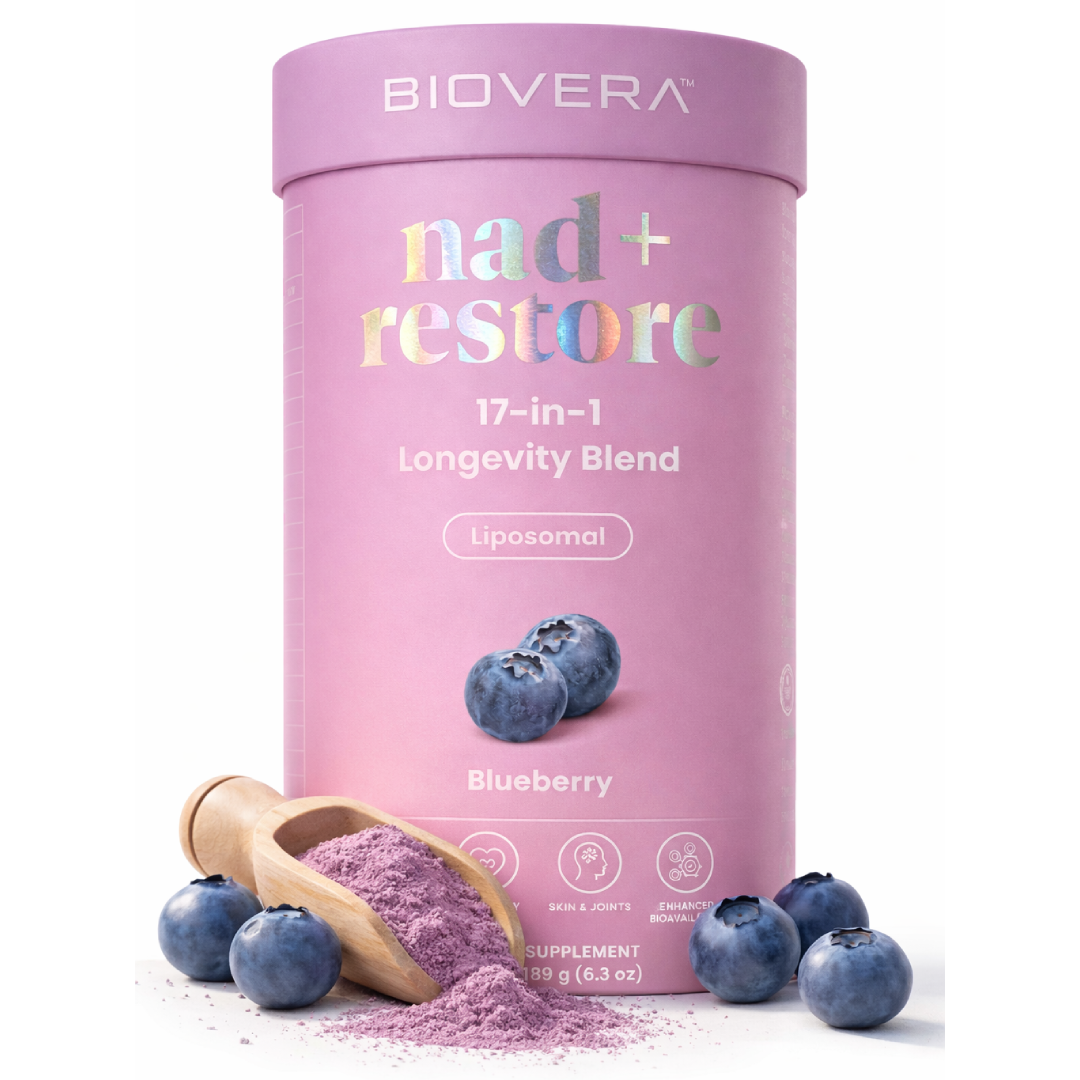 Biovera NAD+ Restore® combines 17 complementary ingredients — including bioavailable NAD+ — designed to support energy and long-term vitality in one streamlined daily blend.